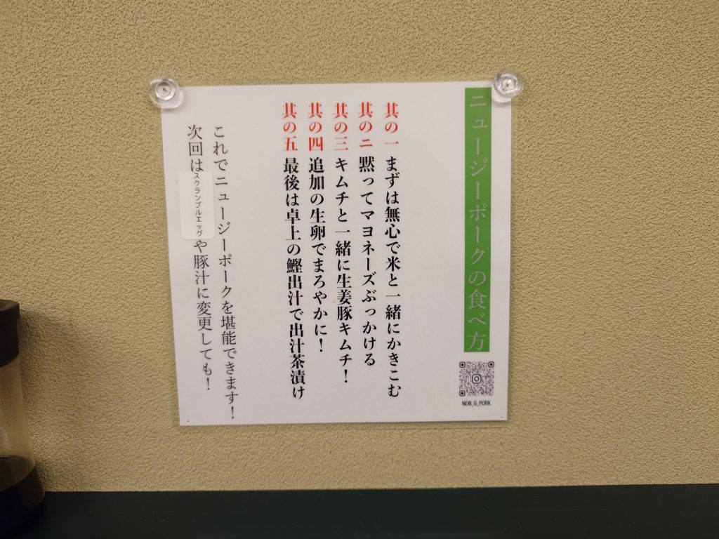 キャベツにニューベイブと同じにんじんドレッシングをかけ、掲示されている「ニュージーポークの食べ方」に従って食します。